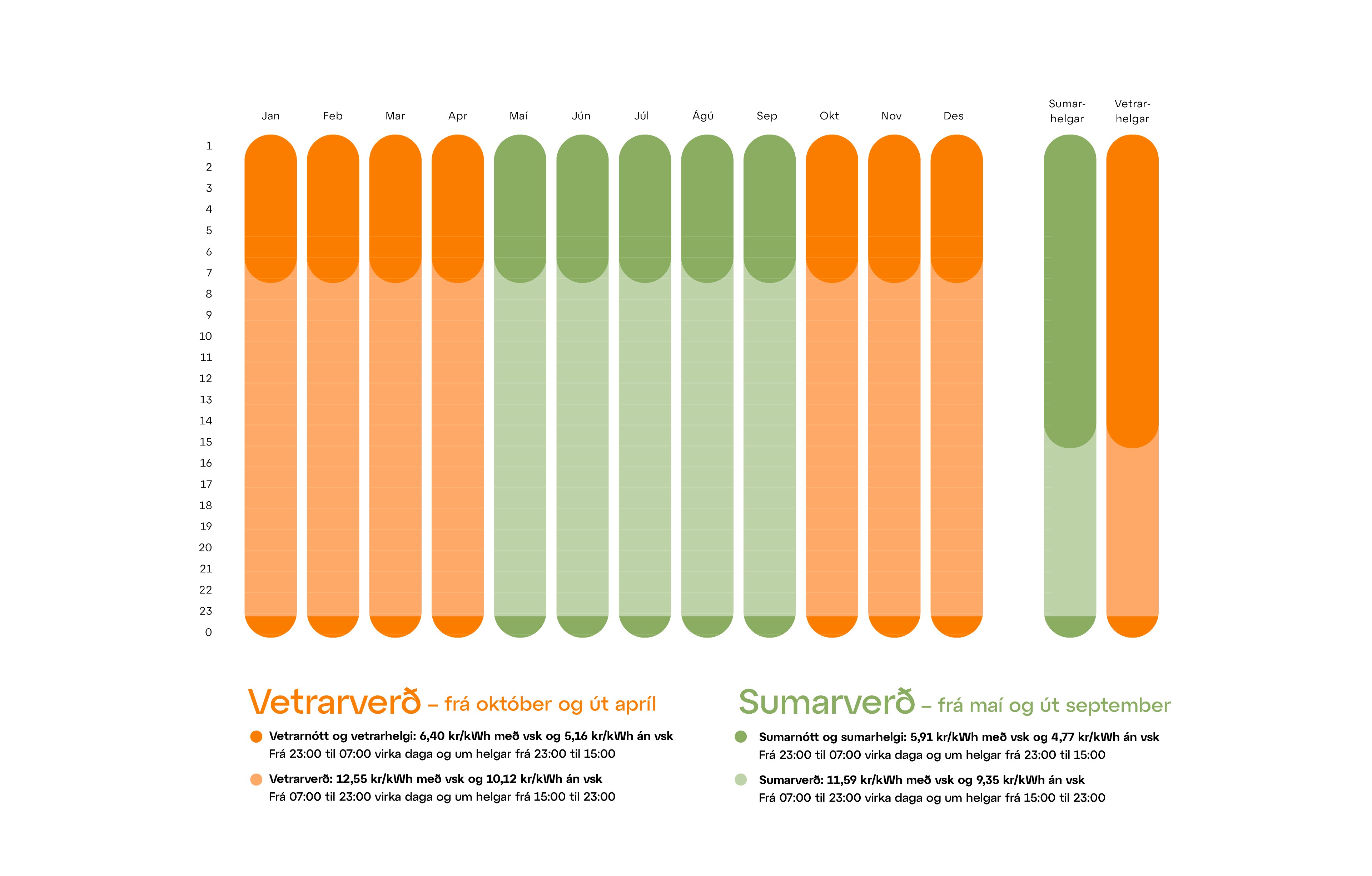 Verðið breytist eftir því hvenær þú notar rafmagnið – oft er það ódýrara á ákveðnum tímum. Ef þú notar meira rafmagn þegar verðið er lágt, getur þú lækkað rafmagnsreikninginn þinn, einfaldlega með því að hugsa um hvenær þú kveikir á tækinu, hleður rafbílinn þin og svo framvegis.