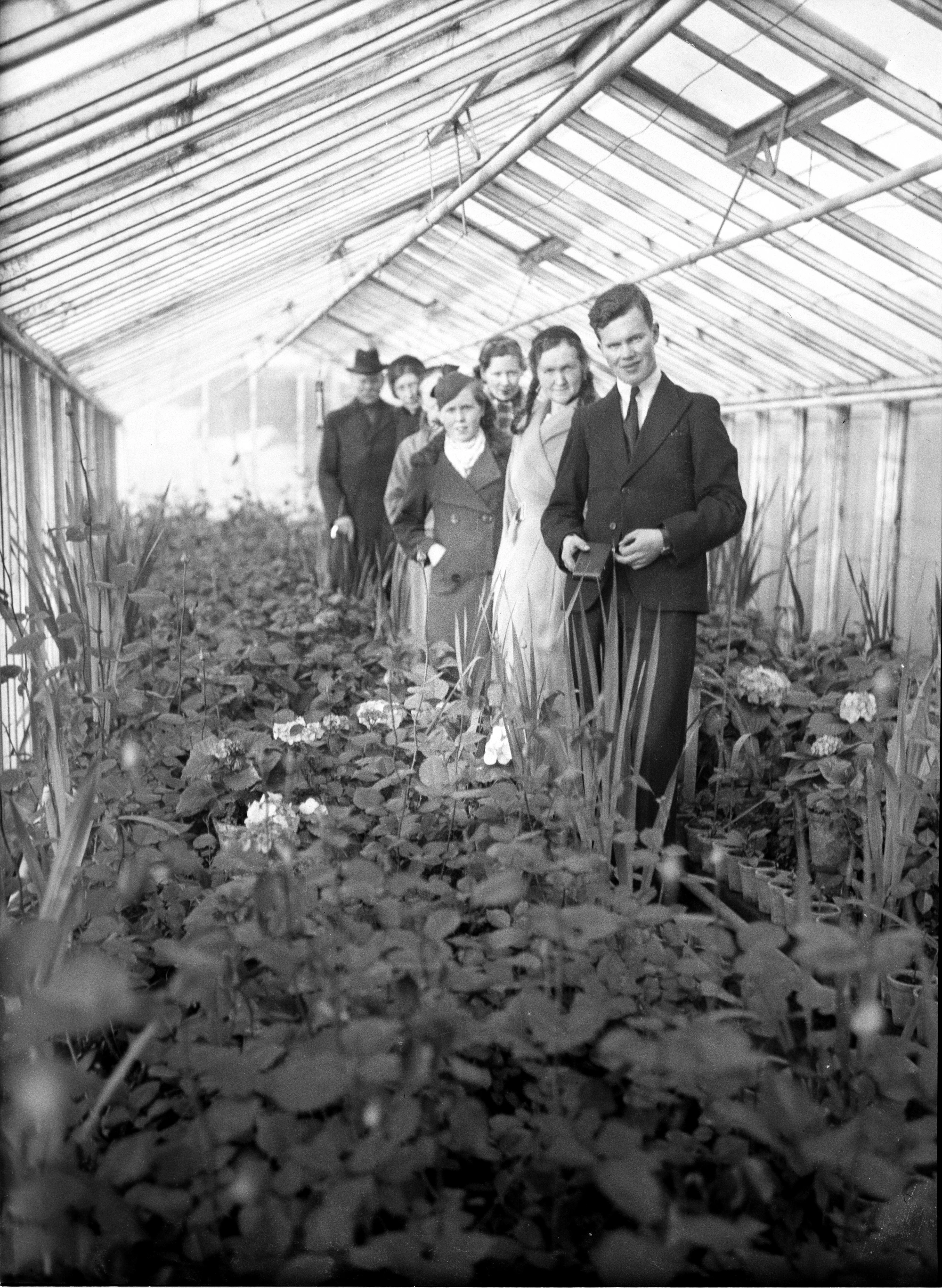 Prúðbúnir gestir í gróðurhúsi í Mosfellssveit á árunum 1935-1940.