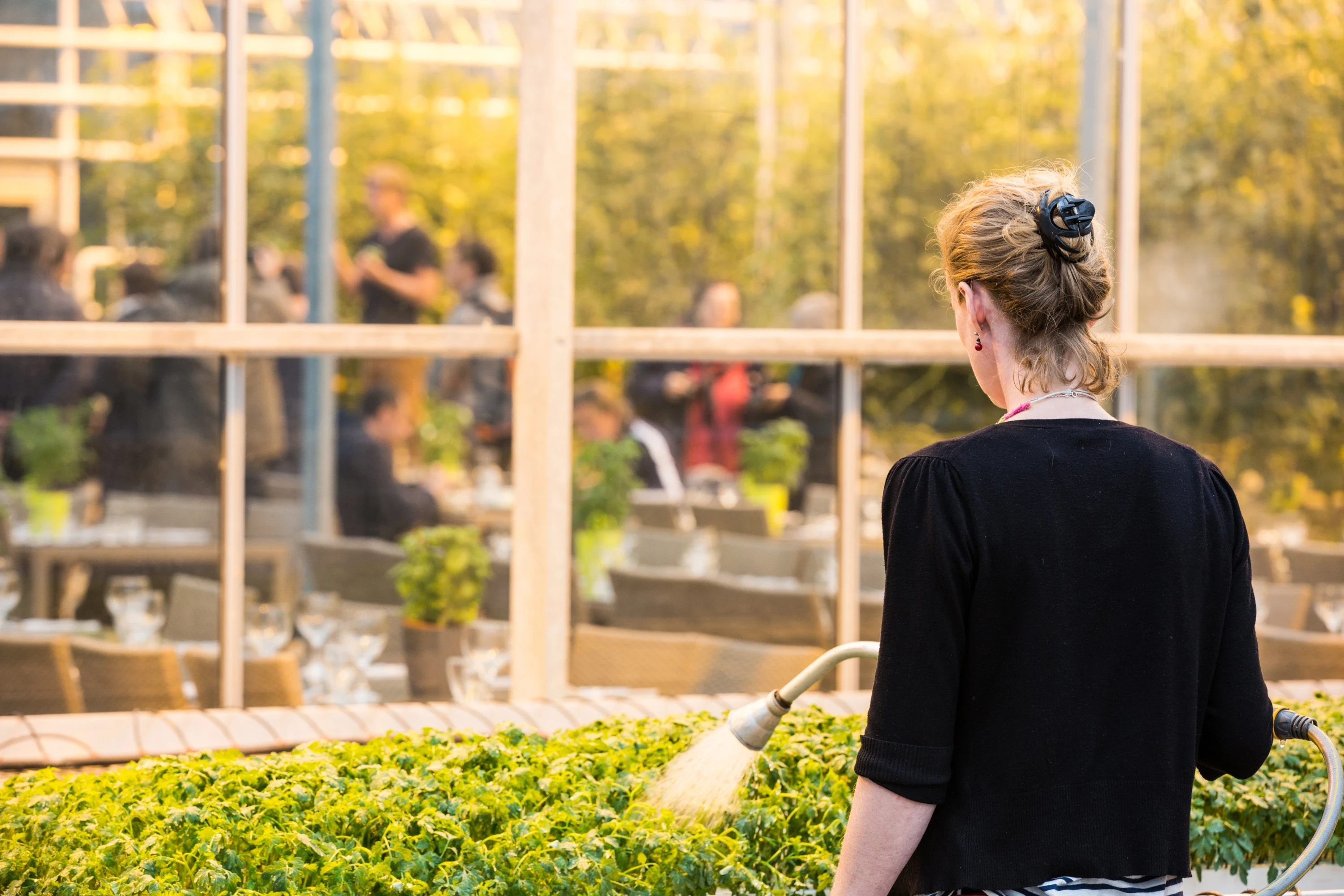 Húsfreyjan Helena vökvar hér salat í gróðurhúsinu í Friðheimum. Í bakgrunni má sjá gesti veitingastaðarins sem býður uppá allskonar rétti úr tómötum og grænmeti sem ræktað er á staðnum.