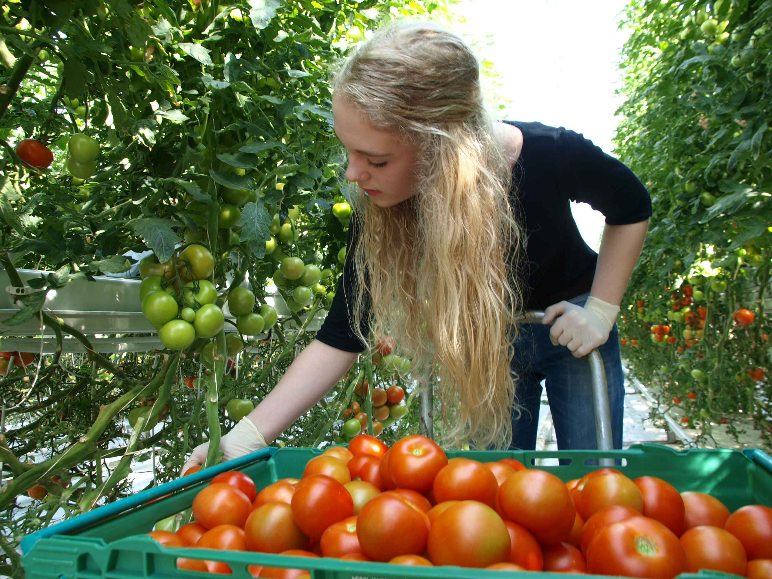 Dóróthea Ármannsdóttir tínir tómata í gróðurhúsinu í Friðheimum. Án jarðhita væri nær ómögulegt að rækta tómata hérlendis.