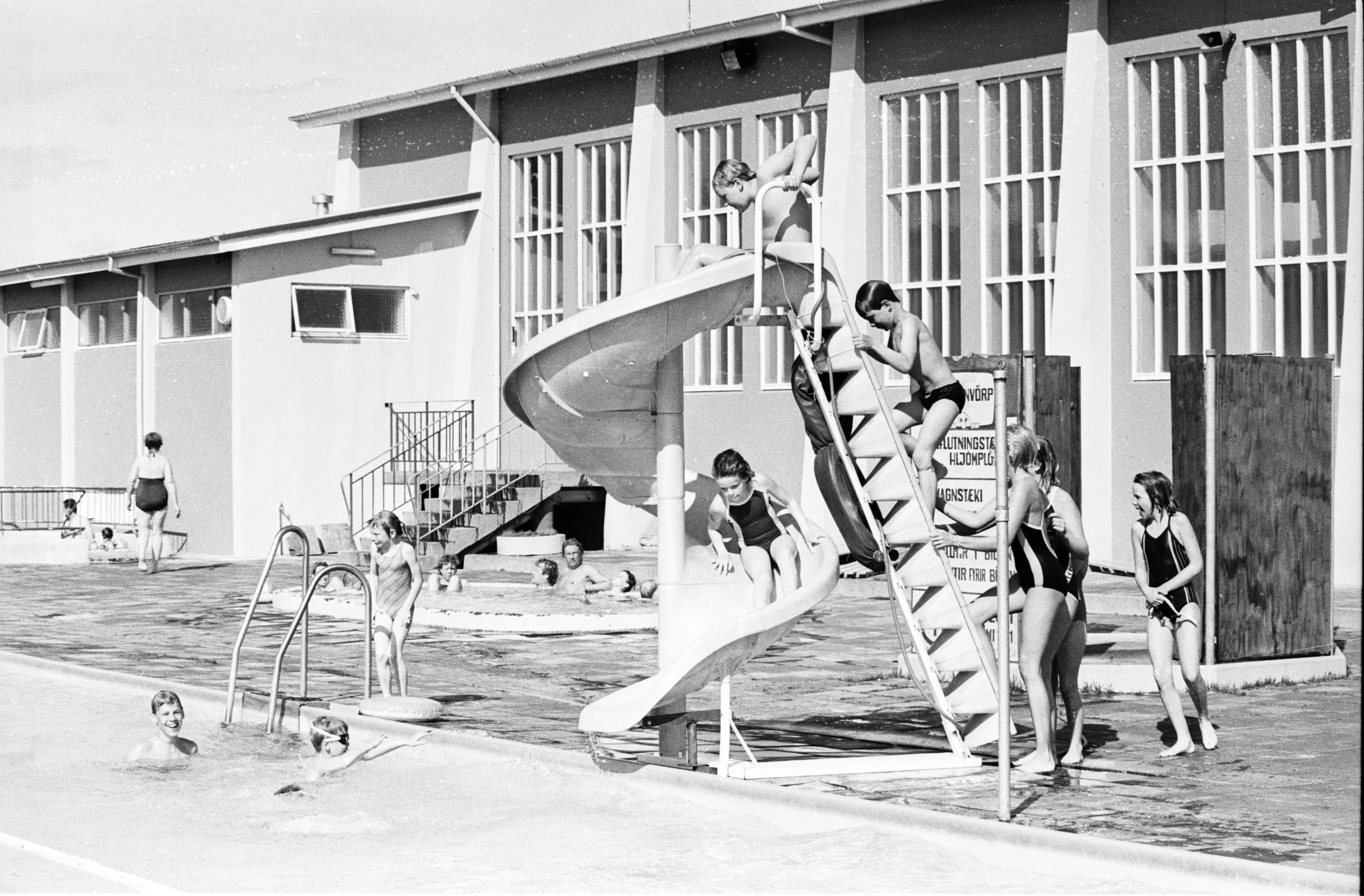 Sundlaugin á Selfossi var lengi vel eina laugin á landinu sem var með rennibraut en þessi mynd er tekin 1985. Nú er hún ef til vill frægust fyrir “Ostinn”, rennibraut fyrir yngstu kynslóðina.