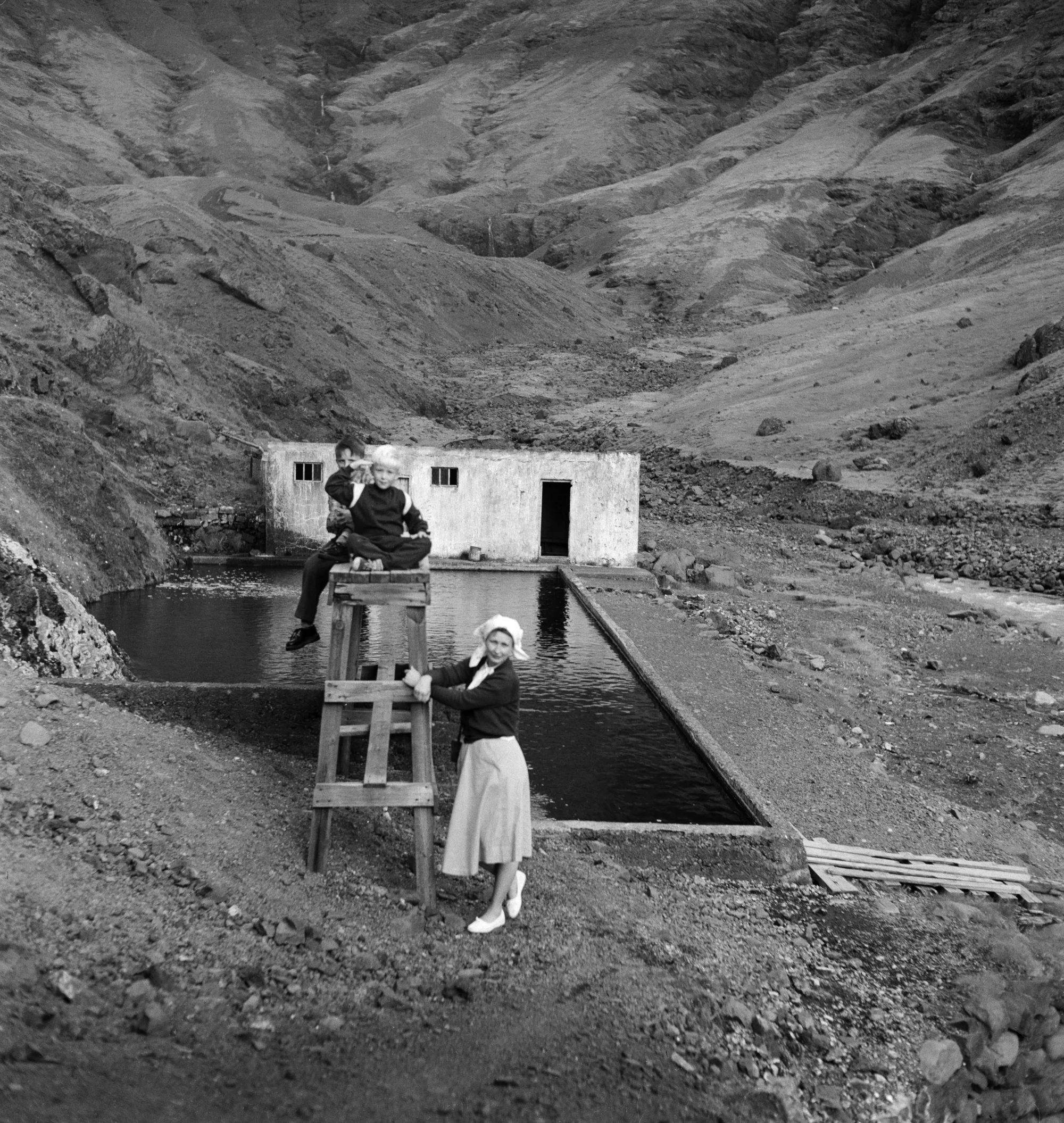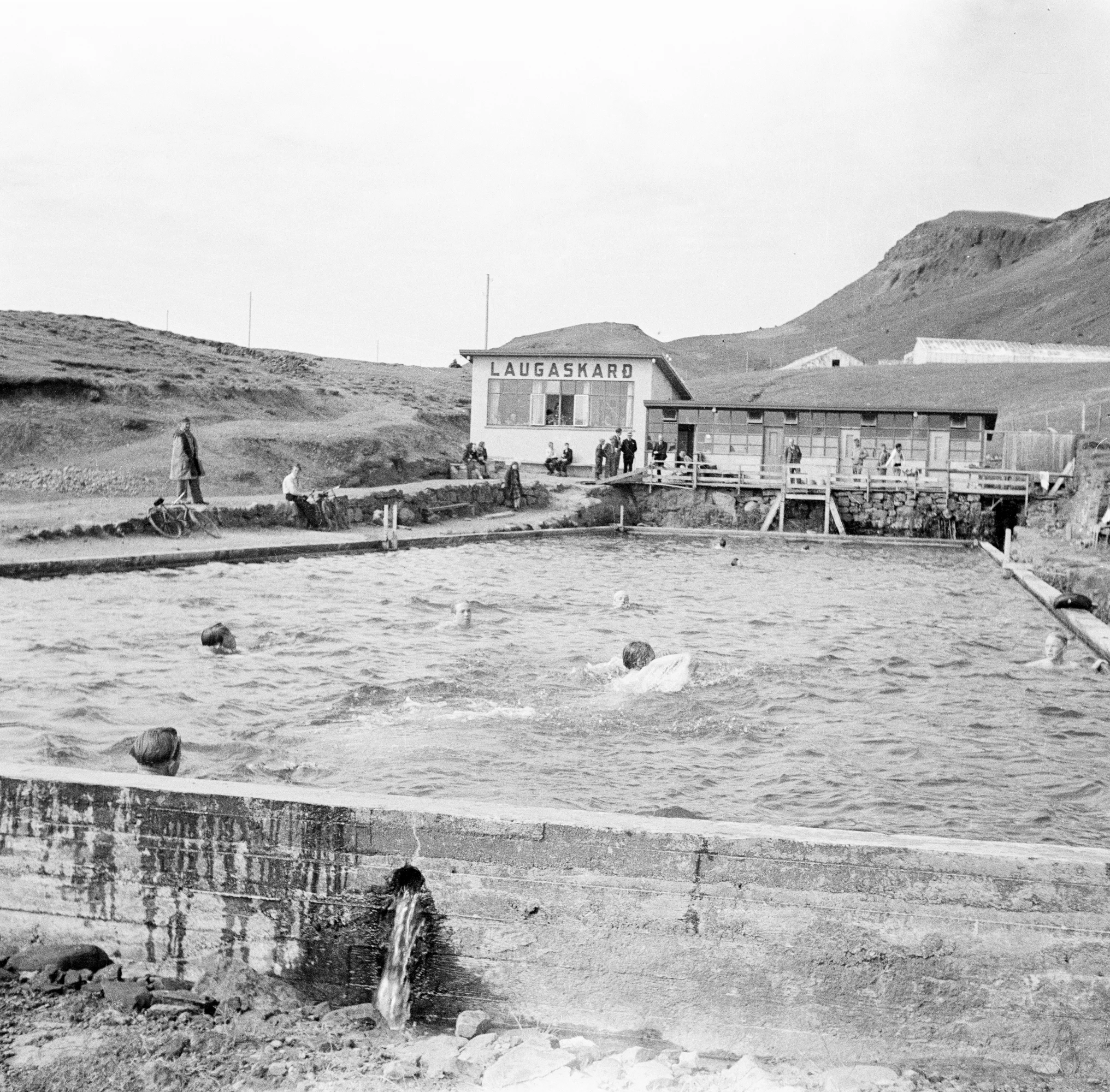 Seljavallalaug var byggð árið 1923 en þessi mynd er tekin á árunum 1950-1955. Þrátt fyrir að lauginni hafi verið lokað er enn vatn í henni og ferðalangar duglegir að stelast til að fá sér sundsprett.