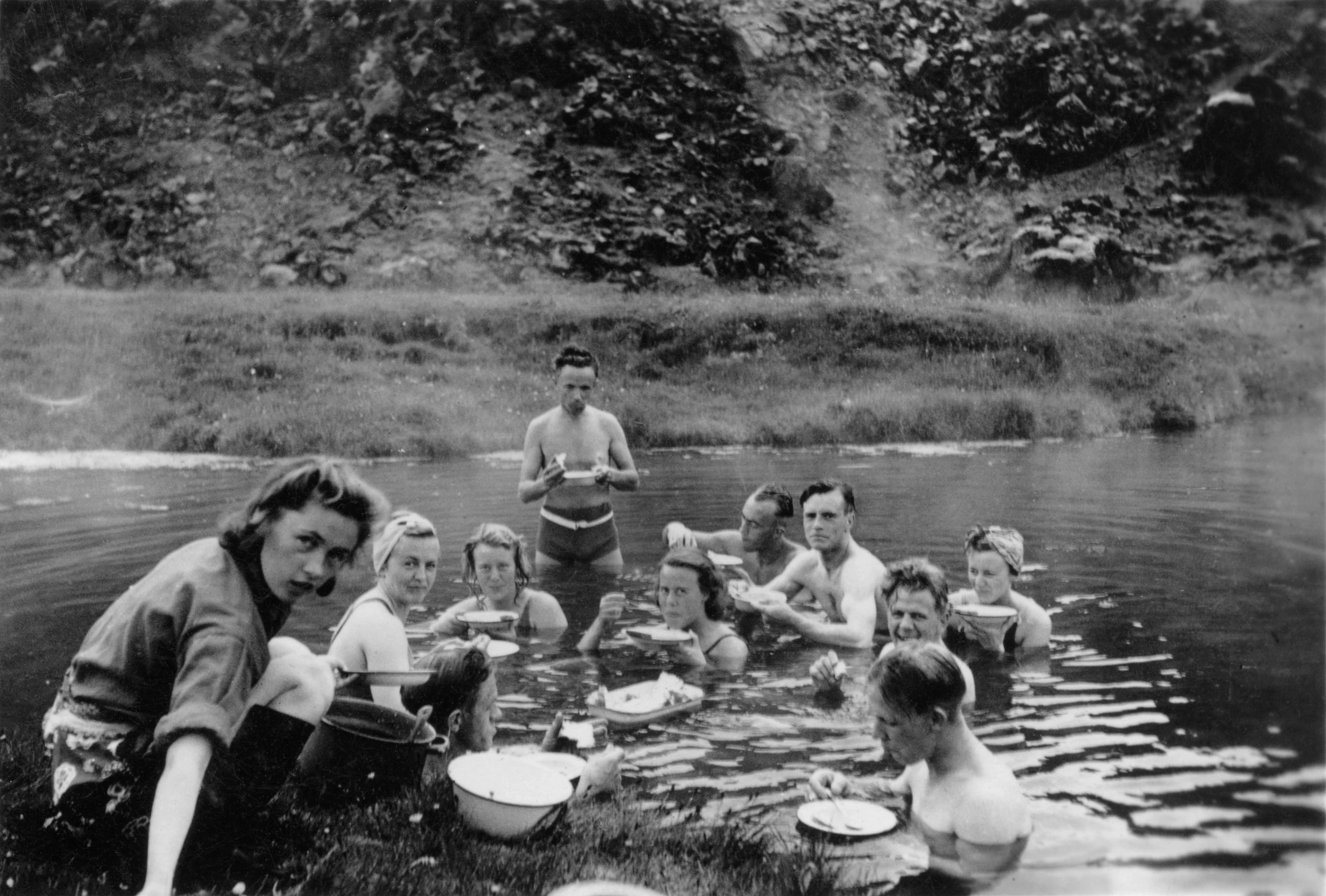 Heitar laugar hafa ávallt verið griðastaður Íslendinga þar sem hægt er að gleyma raunum heimsins. Þessi mynd er tekin í Landmannalaugum árið 1943 á meðan heimsstyrjöldin síðari er í algleymingi.