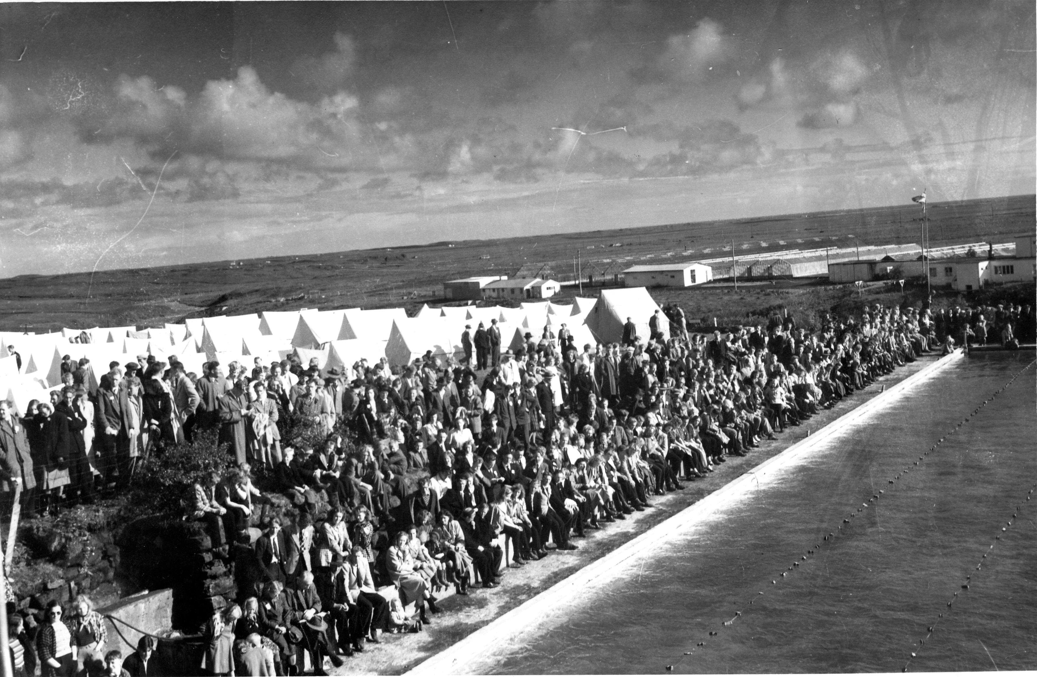 UMFÍ Íslandsmót í Hveragerði, árið 1949. Margt er um manninn og spennan mikil fyrir kappsundið sem um það bil er að hefjast.